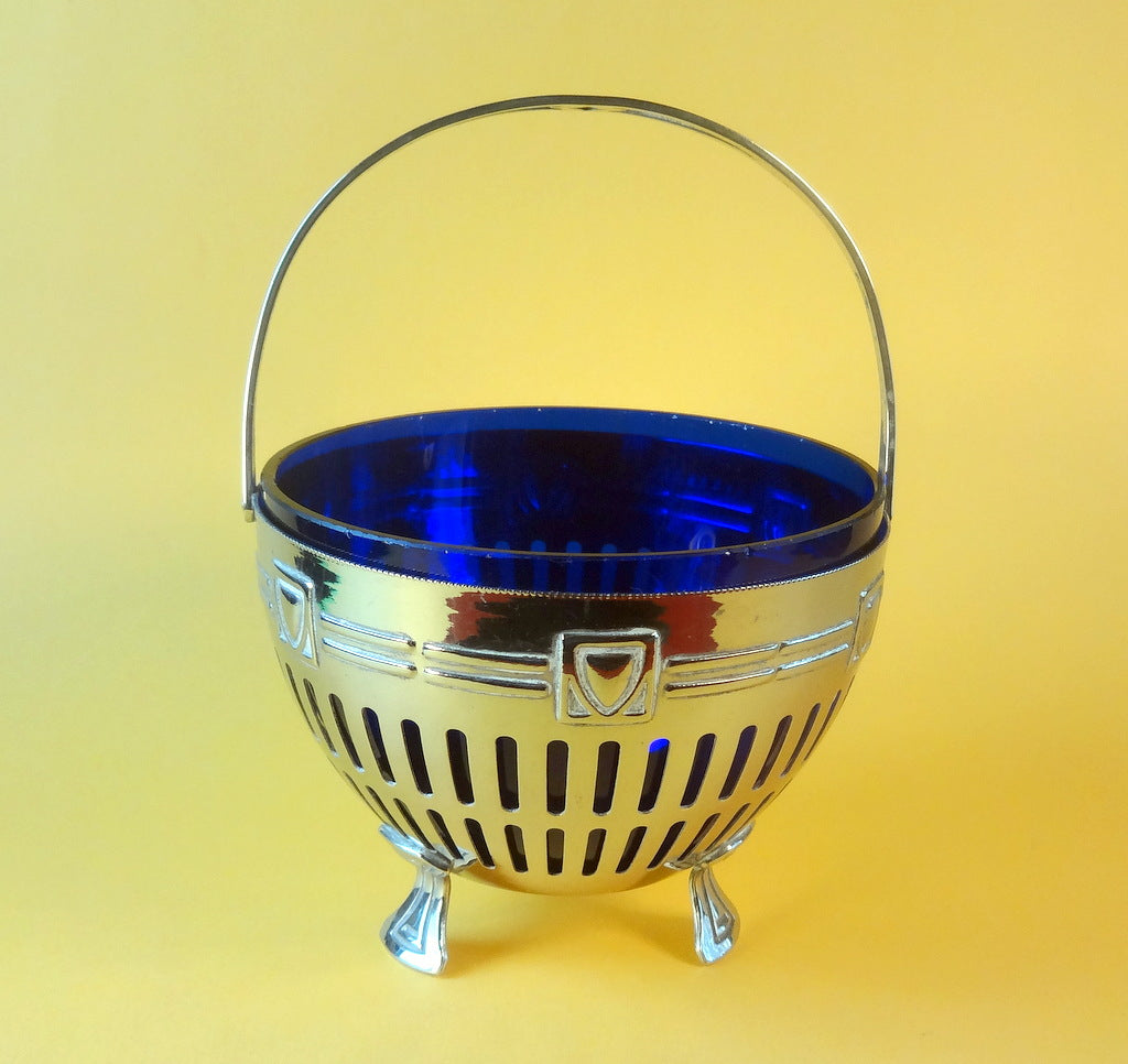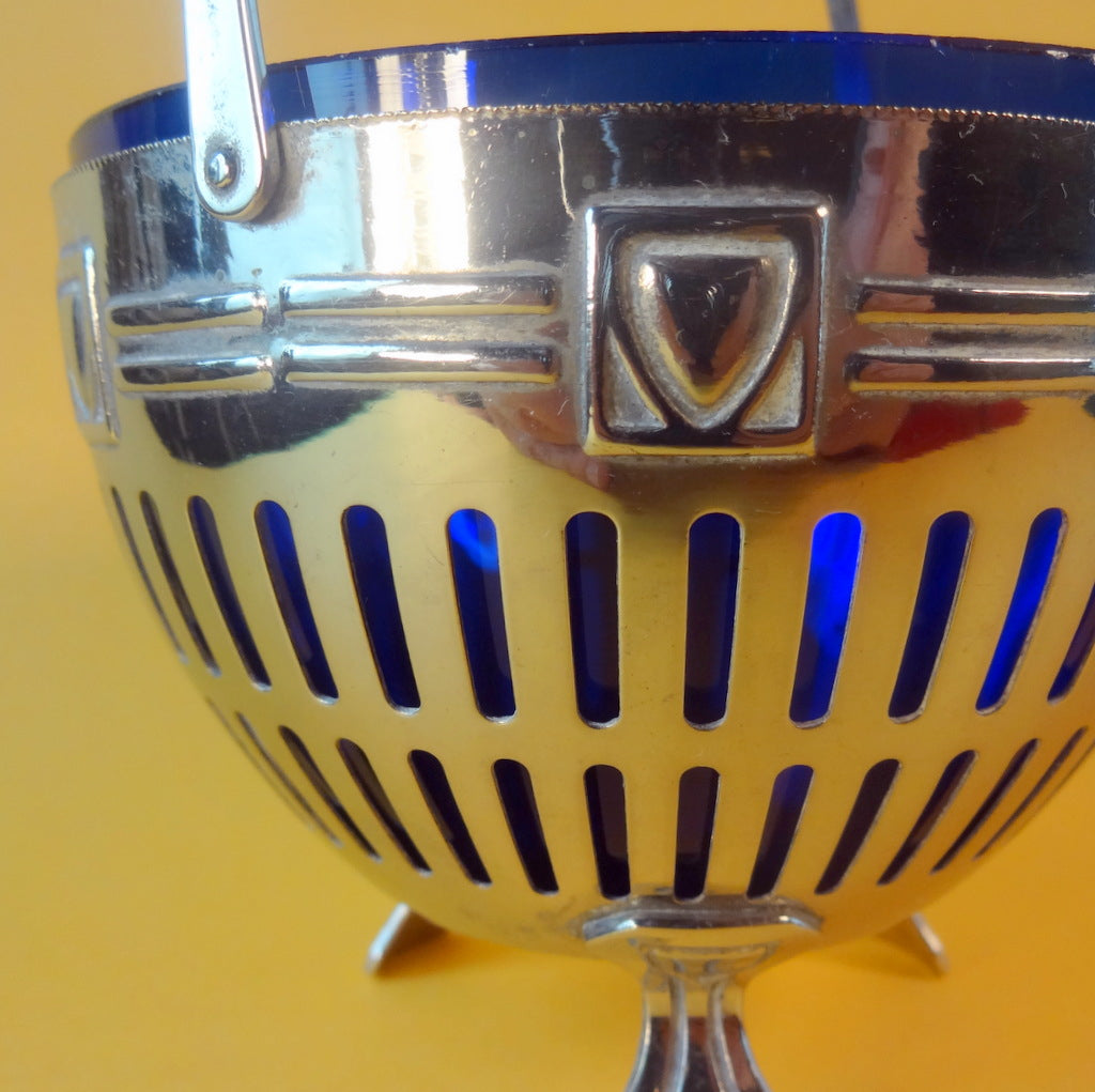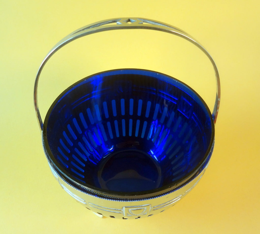 Beskrivelse: Sukkerskål af forsølvet metal med indsats af blåt slebet glas.