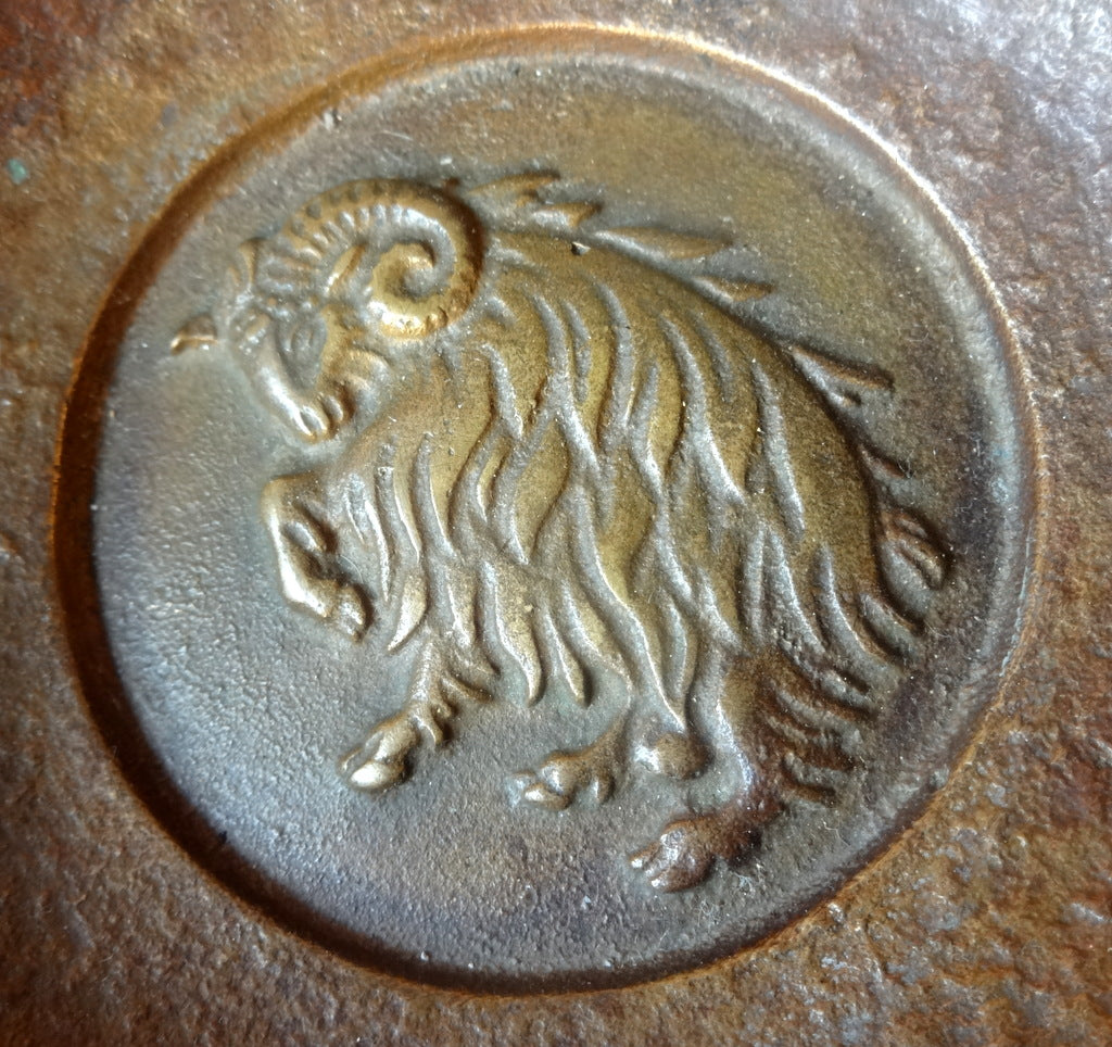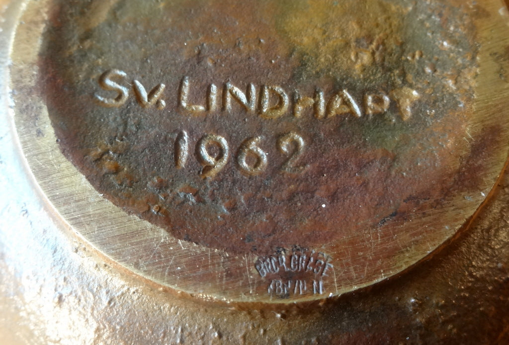 Beskrivelse: Skål med indvendigt motiv af vædder, på bagside signeret SV.Lindhart, støbt hos brødrene Grage bronze støberi.