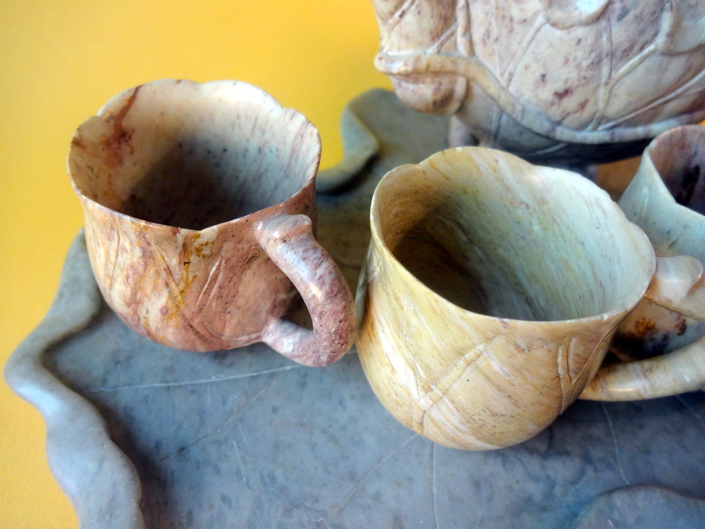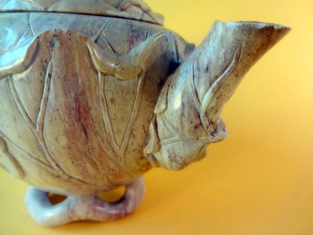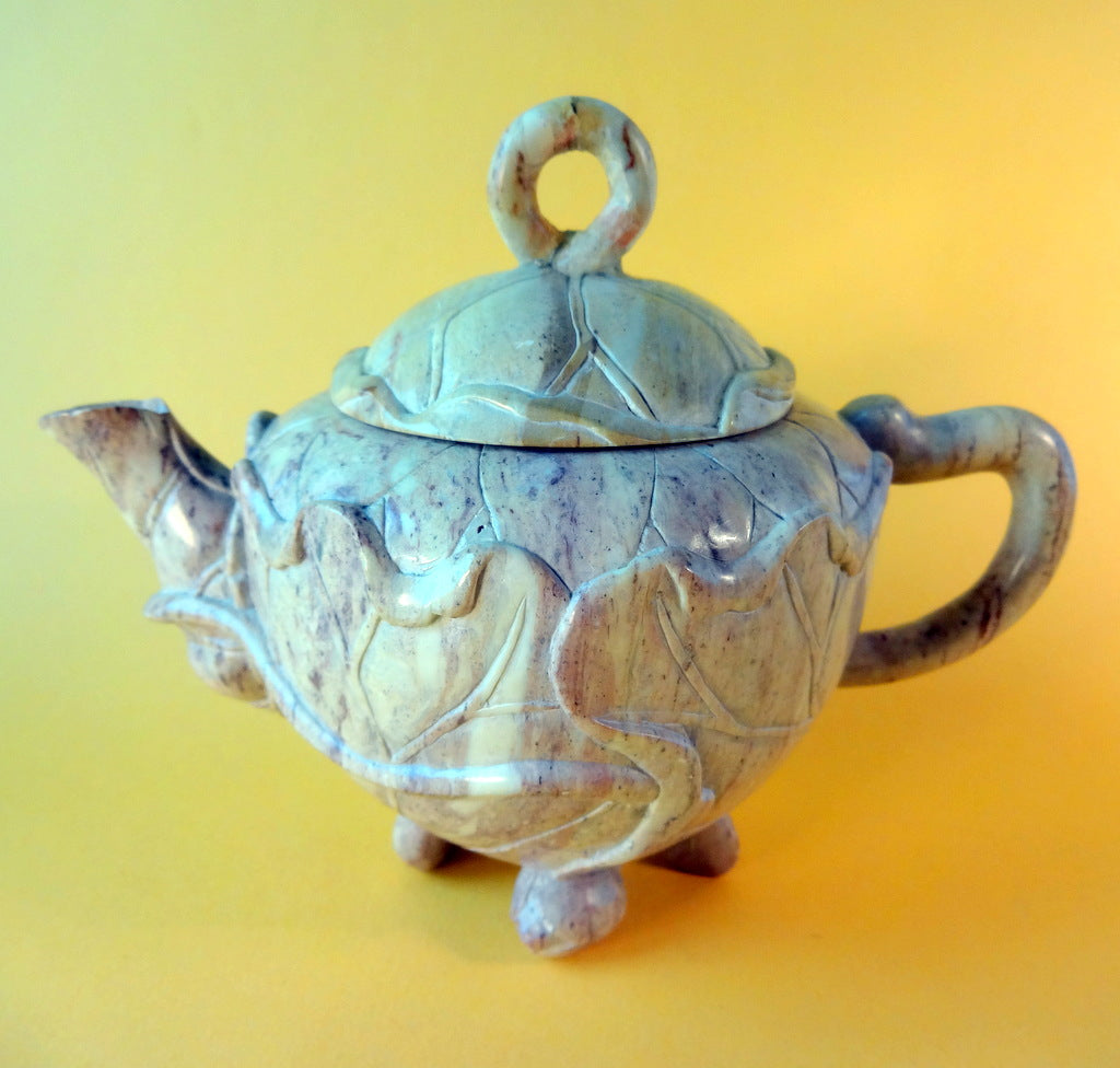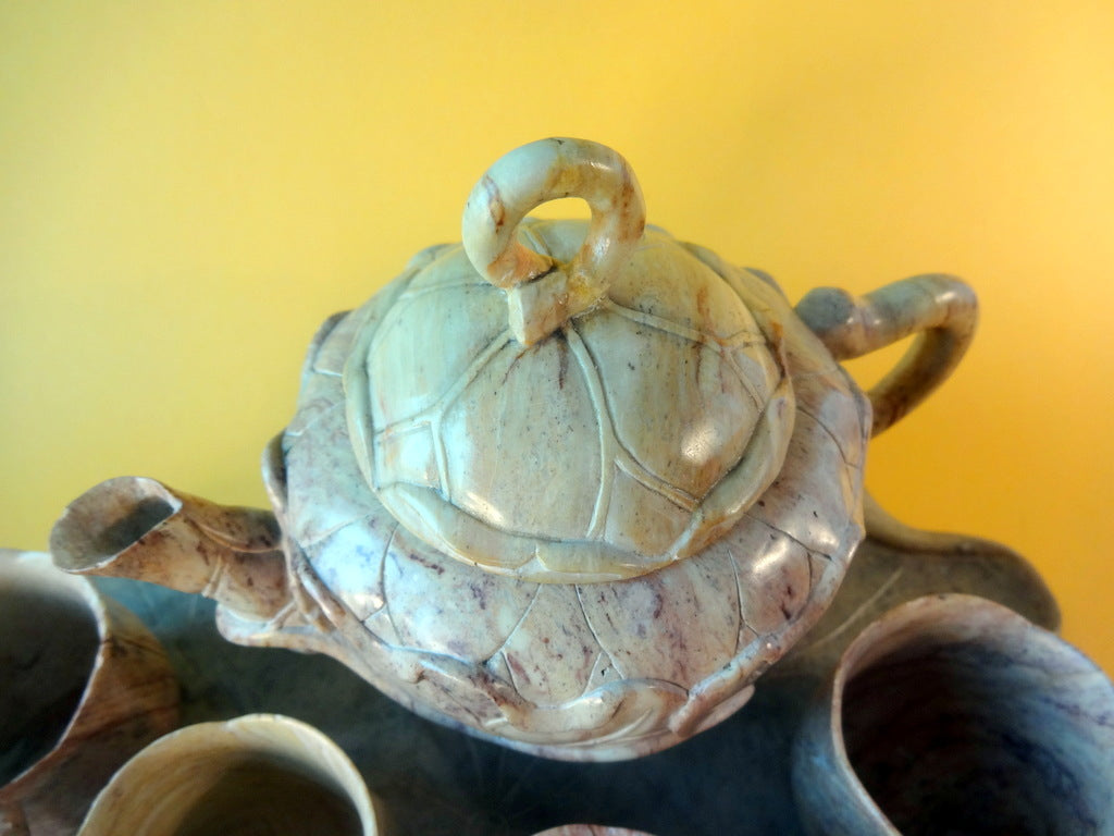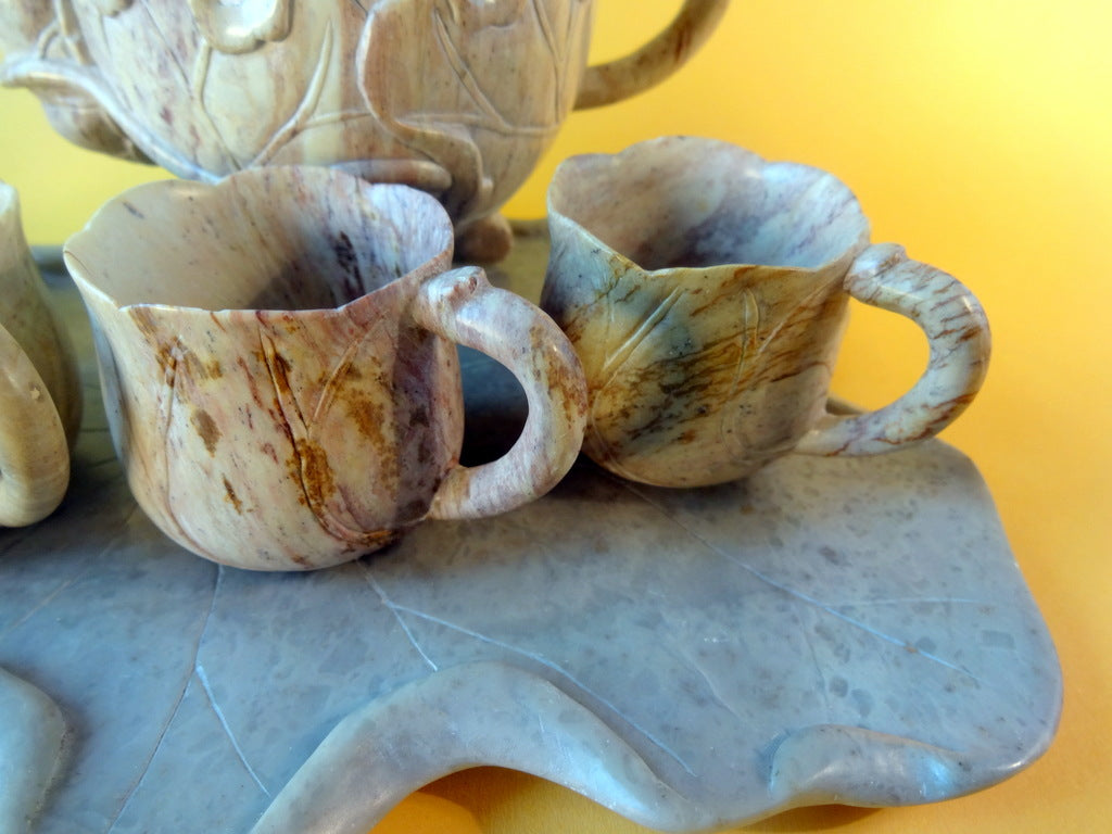 Beskrivelse: Kinesisk stel af udskåret sten. Det hele i smuk organisk form (art noveau stil) anvendt til te eller varm skyld. Højde: 11 cm. (på potte)