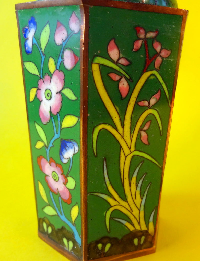 Beskrivelse: Tedåse af cloisonne på grøn emalje, også indvendig emaljeret, i bund mærket CHINA. Motiv blomstrende prunus. Højde: 14 cm