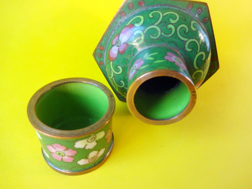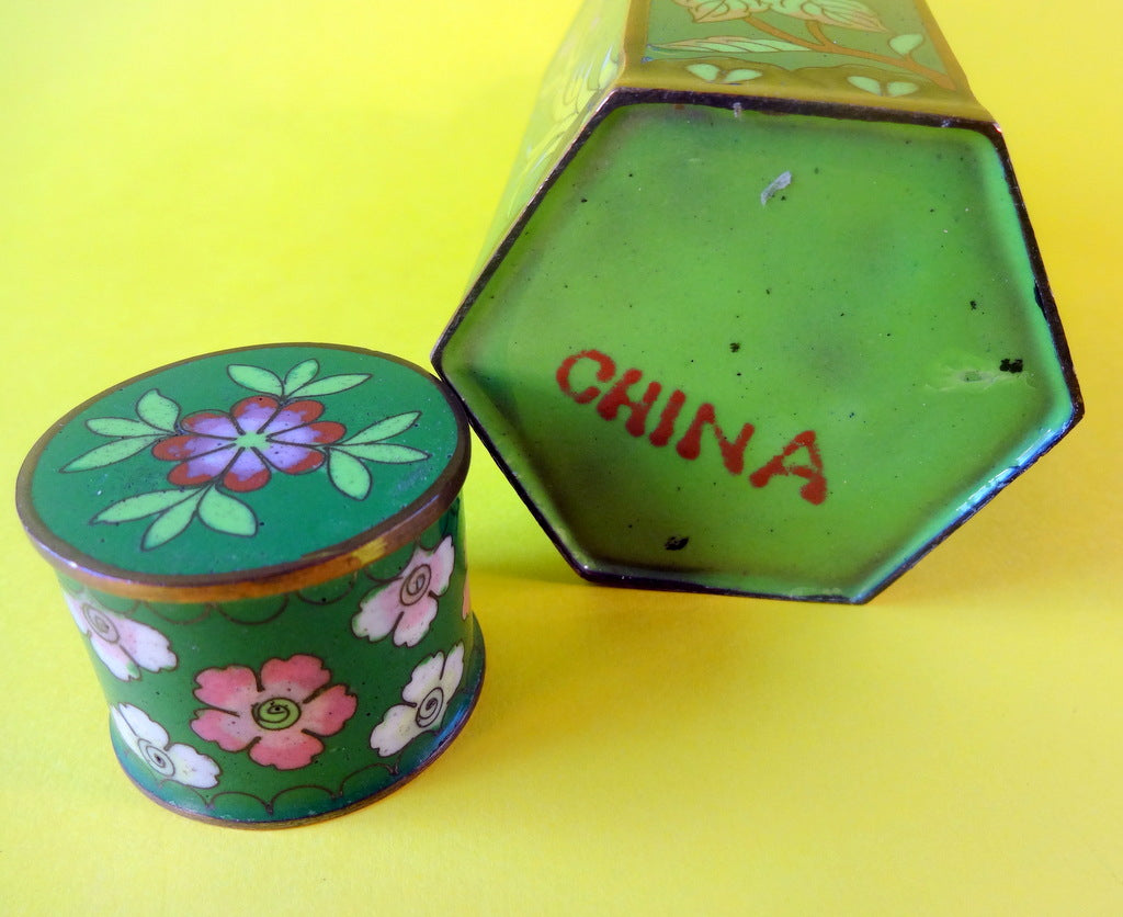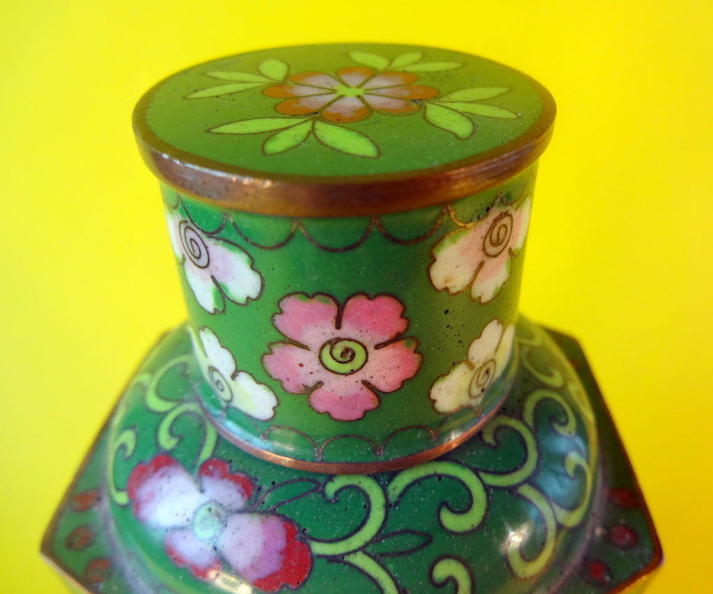 , Årstal: ca. 1910.Beskrivelse: Tedåse af cloisonne på grøn emalje, også indvendig emaljeret, i bund mærket CHINA. Motiv blomstrende prunus. Højde: 14 cm