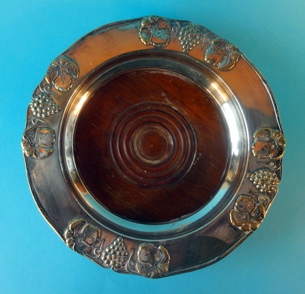 Beskrivelse: Engelsk vinbakke af forsølvet messing med druemotiv på kant. Bund af træ. Diameter: 16 cm
