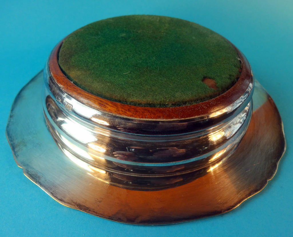 , Årstal: ca. 1930.Beskrivelse: Engelsk vinbakke af forsølvet messing med druemotiv på kant. Bund af træ. Diameter: 16 cm